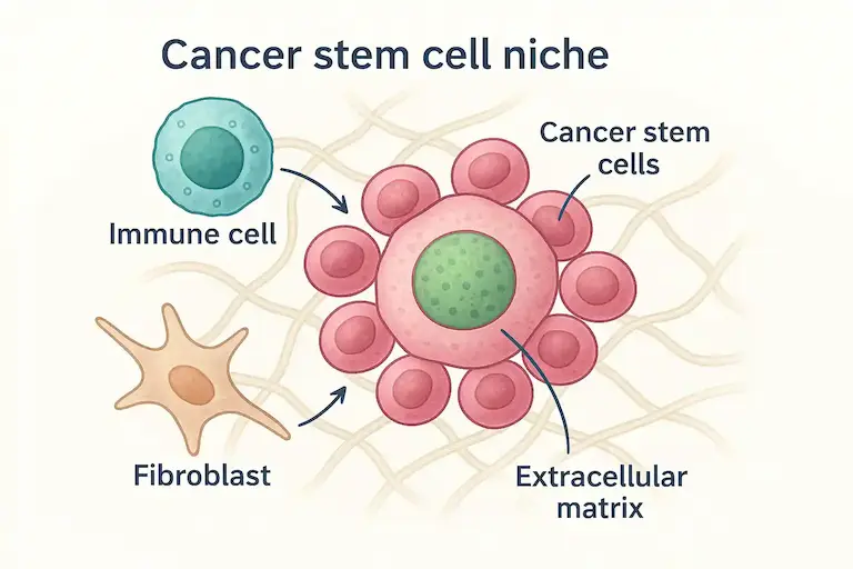 Cardiff University website says: This type of stem cell represents a small proportion of the types of cell found in a tumour, and can replicate tumour cells, causing tumours to grow and spread. Cancer stem cells are considered resistant to drug and radiotherapy treatments, and therefore can be left behind after the course of cancer treatment comes to an end, allowing the tumour to regrow and spread around the body.