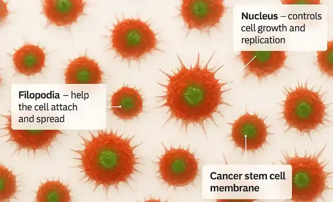 Cardiff University website says: This type of stem cell represents a small proportion of the types of cell found in a tumour, and can replicate tumour cells, causing tumours to grow and spread. Cancer stem cells are considered resistant to drug and radiotherapy treatments, and therefore can be left behind after the course of cancer treatment comes to an end, allowing the tumour to regrow and spread around the body.